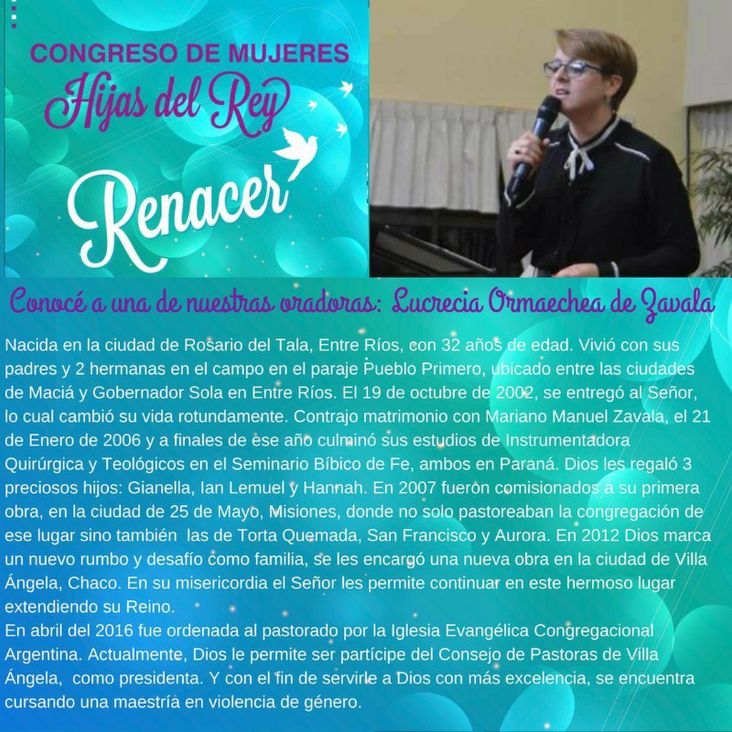 bajo el lema “RENACER”. El mismo se llevará a cabo los días 8, 9 y 10 de Septiembre en nuestra Casa “Iglesia Evangélica Congregacional” de Villa Ángela. Contaremos con la presencia de las Pastoras Andrea Francisco, Mariela Guzman y Lucrecia de Zavala. Tal evento no tiene costo de inscripción y habrá servicio de buffet.